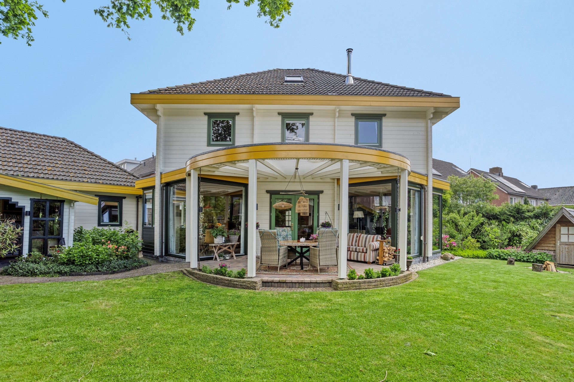 De fraai aangelegde achtertuin omsluit de woning en biedt volop privacy, gezelligheid en rust. Grenzend aan de woning bevindt zich een sfeervolle overkapping waar u heerlijk kunt ontspannen en genieten van het buitenzijn. Daarnaast beschikt het perceel over een groot & geïsoleerd vrijstaand bijgebouw van meer dan 60 m² – ideaal als hobbyruimte, werkplaats, gastenverblijf of praktijk aan huis. Verder is er voldoende plek om meerdere auto's te parkeren.