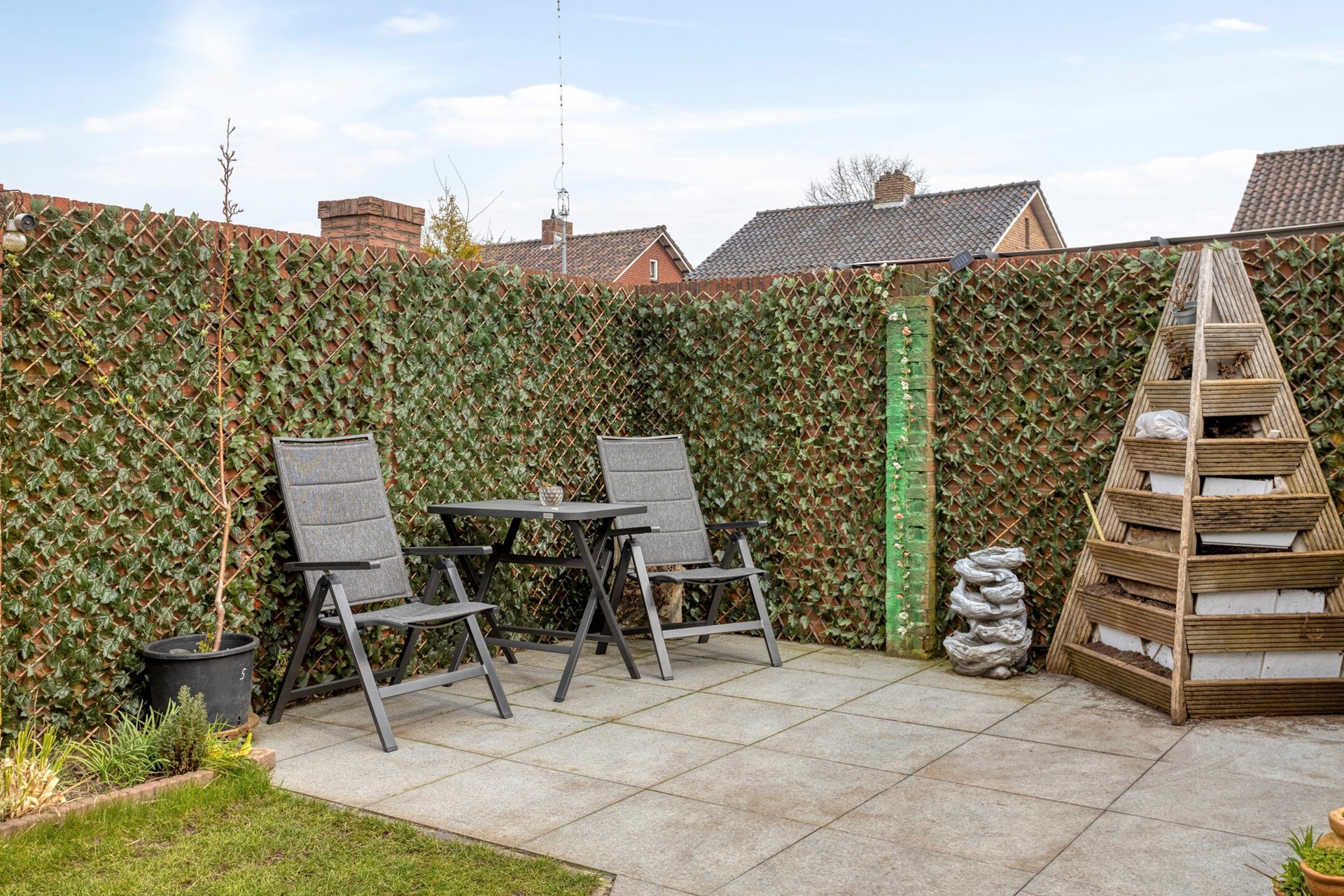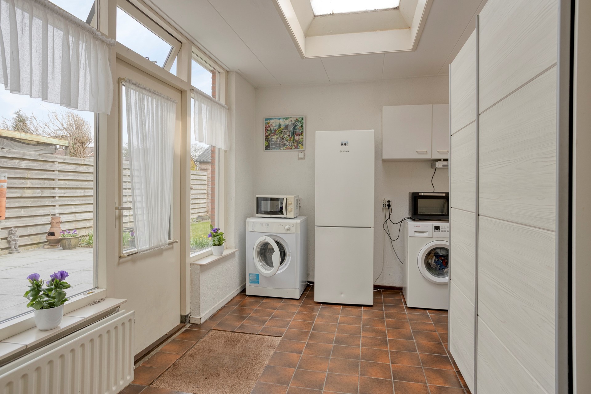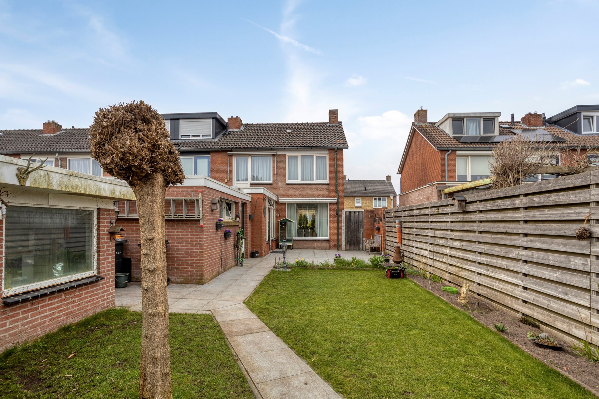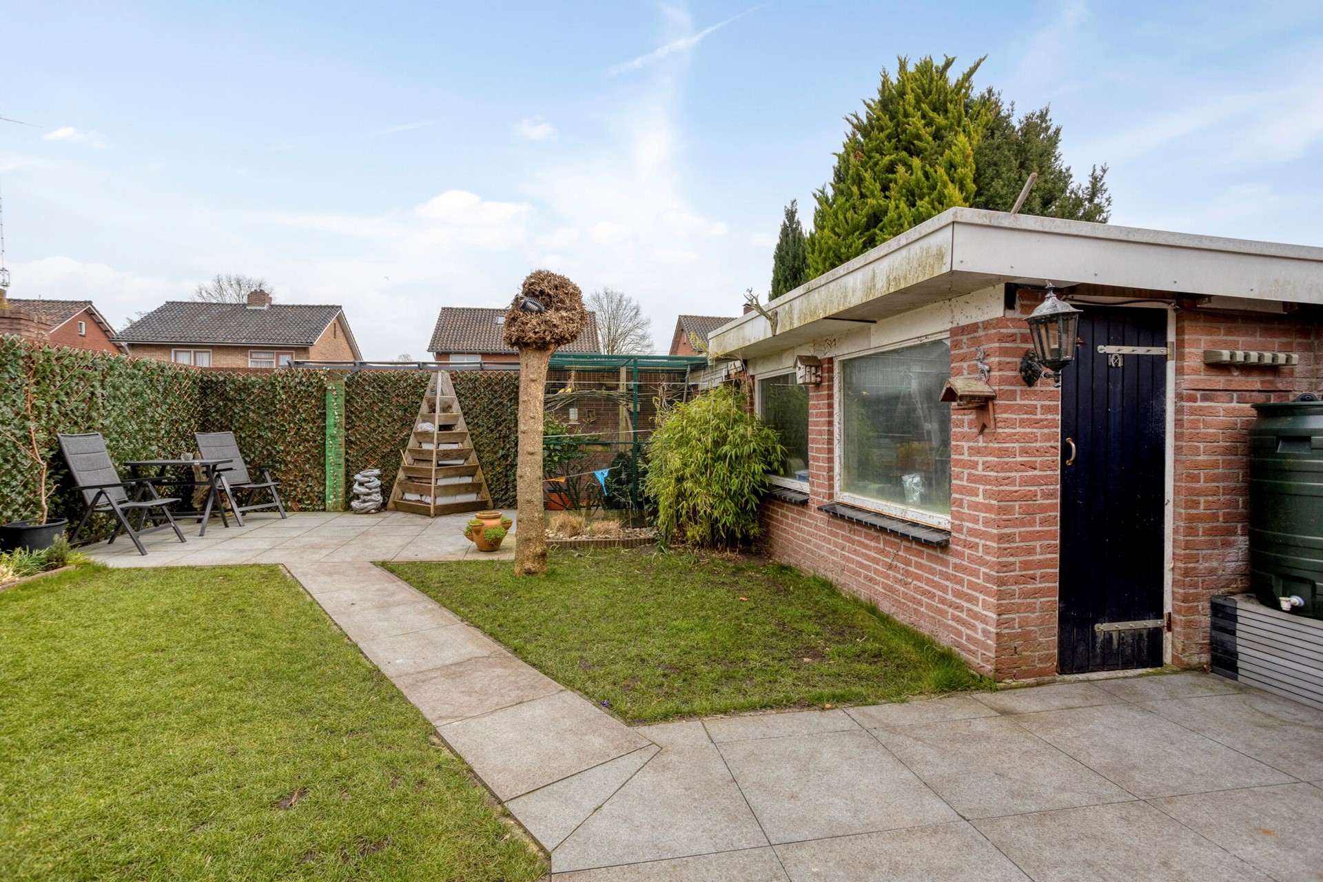 De achtertuin is ruim opgezet en bestaat uit een combinatie van bestrating en groen, wat zorgt voor een prettige balans tussen onderhoudsgemak en sfeer. In de tuin zijn meerdere terrasmogelijkheden om te genieten van het buitenleven. Daarnaast beschikt de tuin over een extra berging met aansluitend een volière.