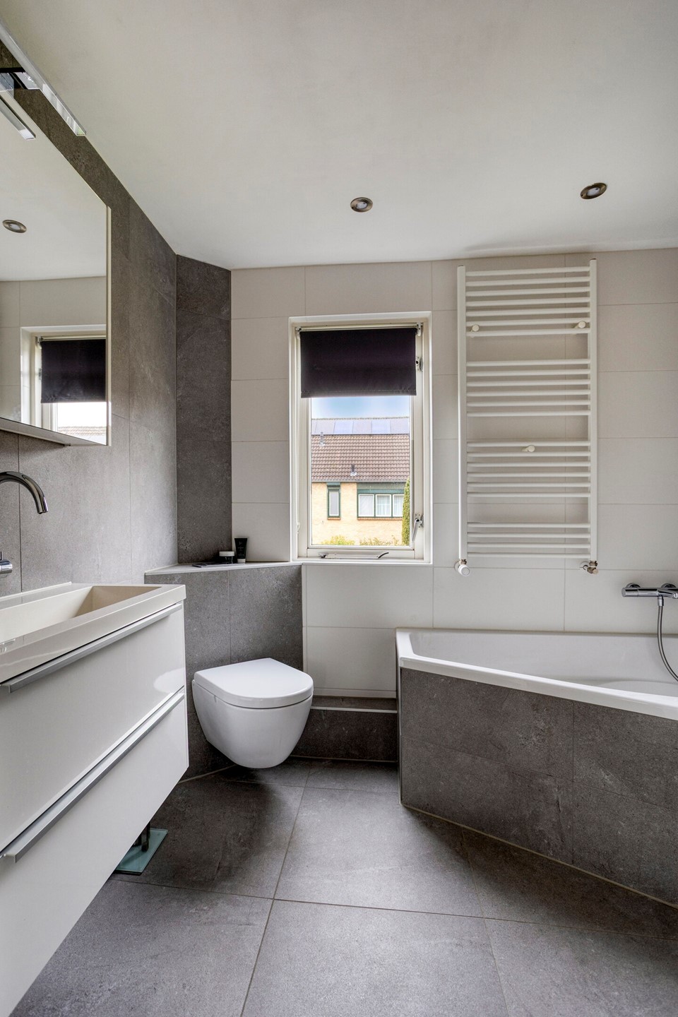 De overloop biedt toegang tot drie slaapkamers en een badkamer. Alle slaapkamers beschikken over dezelfde fraaie laminaat vloer en één slaapkamer over een wastafelmeubel. De badkamer is van alle gemakken voorzien; ruime inloopdouche, ligbad, toilet en een wastafelmeubel.