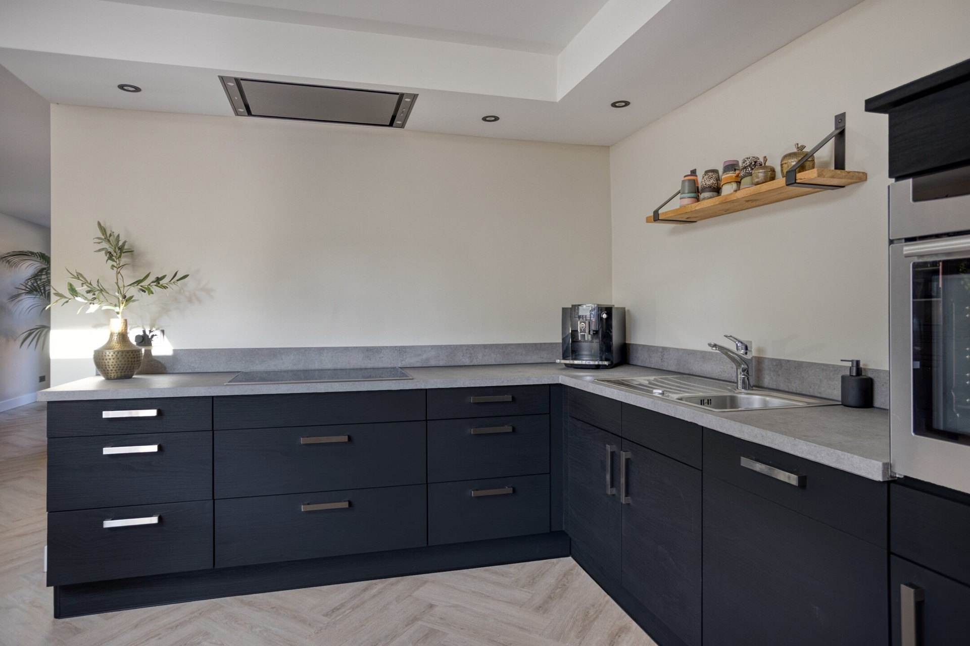 Entree; gave en goed onderhouden PVC visgraat vloer; net vrijdragend toilet met fonteintje; meterkast; toegang tot de woonkamer welke aan de voorzijde is gesitueerd en beschikt over een gaskachel. De eetkamer aan de achterzijde staat direct in verbinding met de moderne leefkeuken welke van alle gemakken én ruimte is voorzien. De keuken beschikt over o.a. een oven, vaatwasser, koelkast, kookplaat én afzuigkap incl. afstandsbediening. Vanuit de keuken is er middels het halletje, waar de Remeha CV ketel (2010, eigendom) en de witgoedaansluitingen bevinden, toegang tot de garage. De garage is ruim van formaat en biedt voldoende opbergruimte.