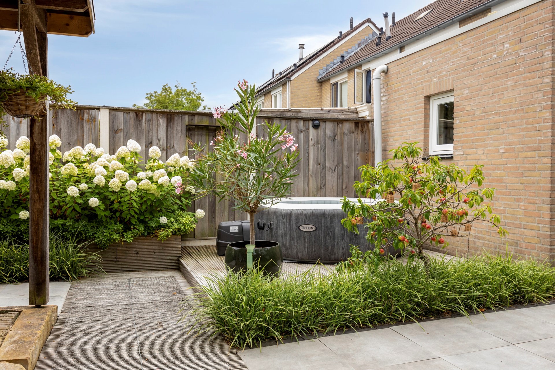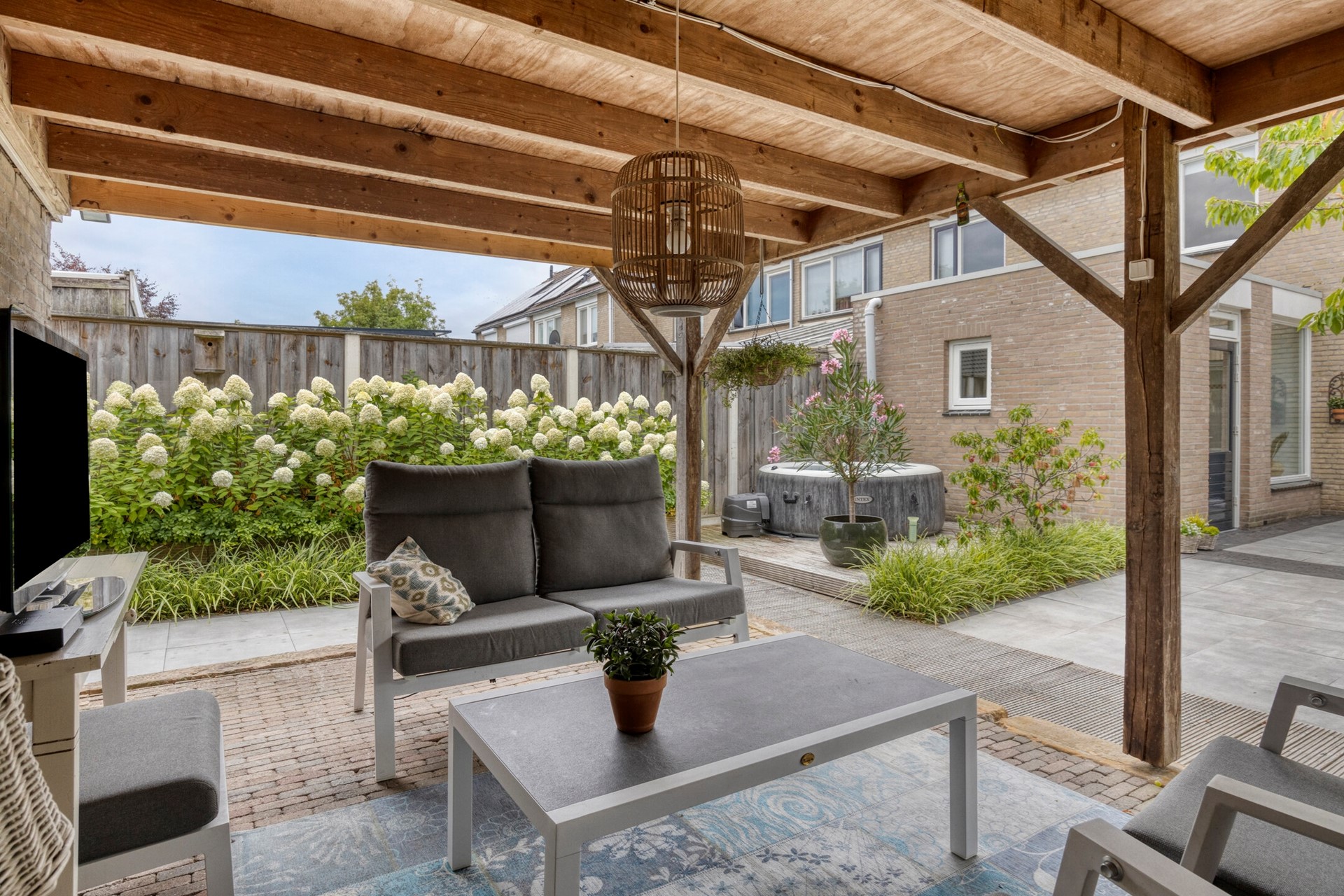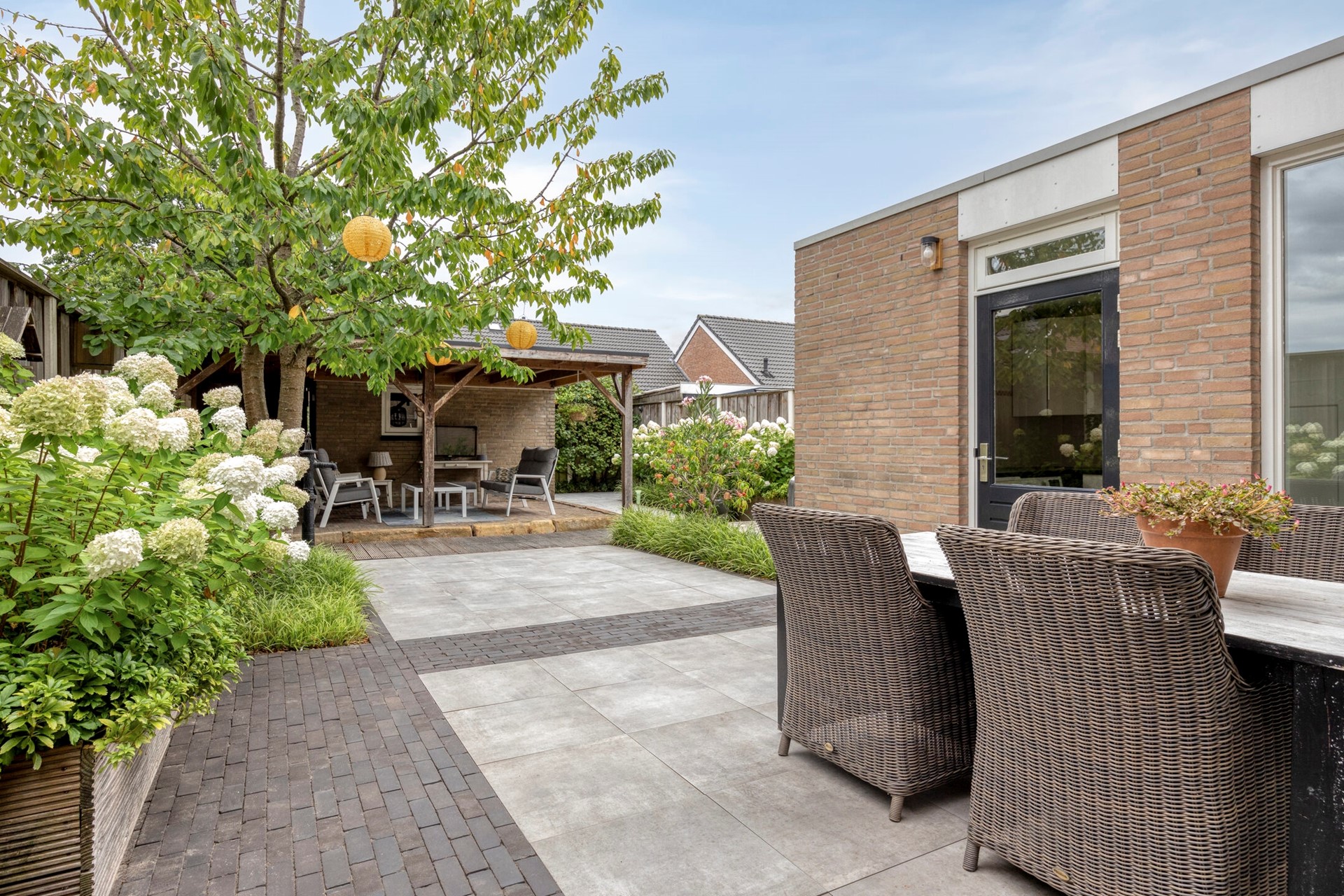 De achtertuin is grotendeels verhard en voorzien van meerdere terrassen. Achterin is een fraaie overkapping gerealiseerd met aansluitend een stenen berging. De tuin is verzorgd aangelegd, biedt volop privacy mede door de prettige hoekligging en beschikt over een handige achterom.