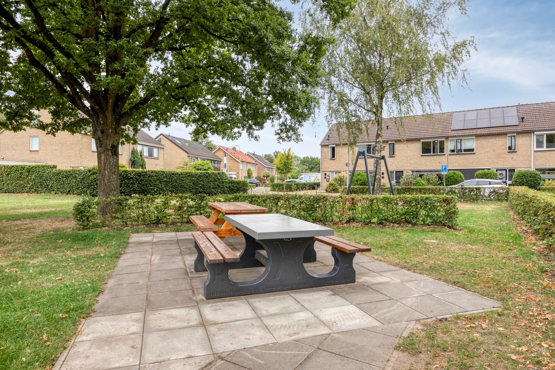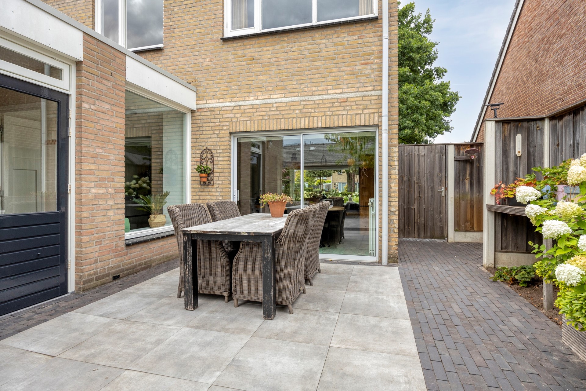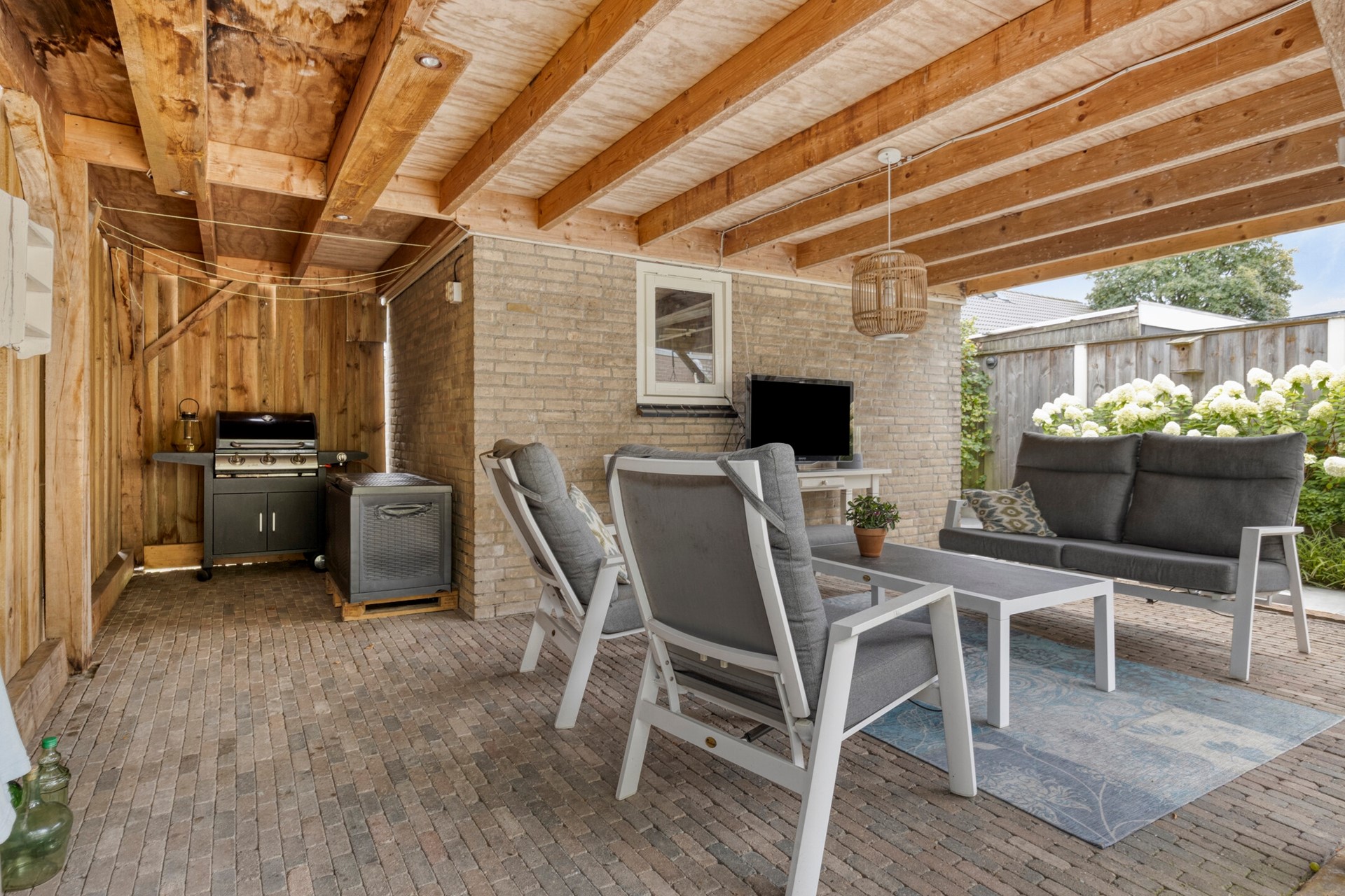 De achtertuin is grotendeels verhard en voorzien van meerdere terrassen. Achterin is een fraaie overkapping gerealiseerd met aansluitend een stenen berging. De tuin is verzorgd aangelegd, biedt volop privacy mede door de prettige hoekligging en beschikt over een handige achterom.