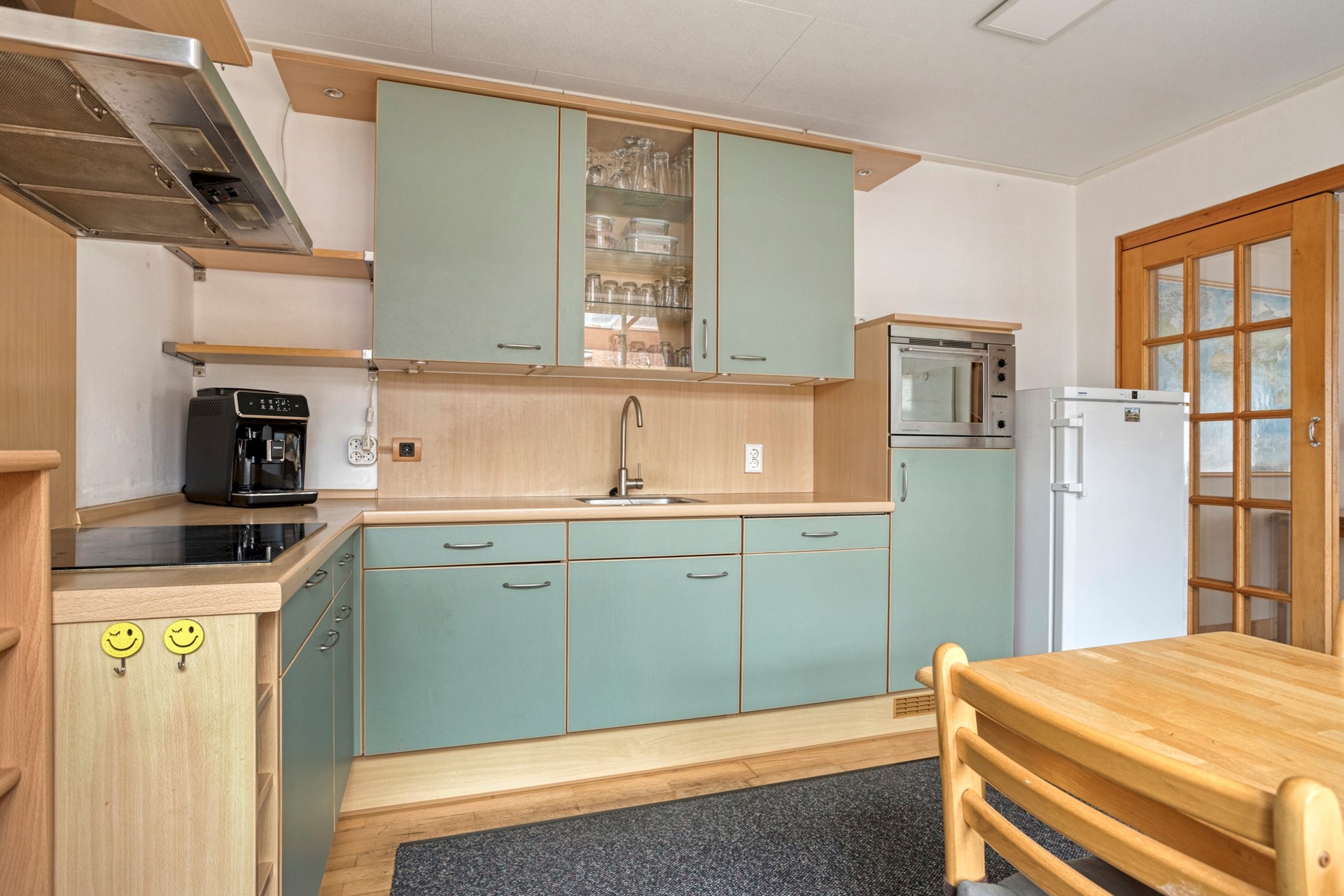 Entree/hal; trapopgang naar eerste verdieping; meterkast; toilet en toegang tot de woonkamer. De ruime woonkamer is aan de voorzijde gelegen en is voorzien van een sfeervolle houten vloer. Aan de achterzijde is er toegang tot de uitbouw, gerealiseerd in 1996, waar de keuken is gesitueerd. De keuken beschikt over een zitgedeelte en een inbouwkeuken. Deze is o.a. voorzien van een vaatwasser, koelkast, kookplaat en combi oven. Vanuit de keuken is er rechtstreeks toegang tot de tuin.
