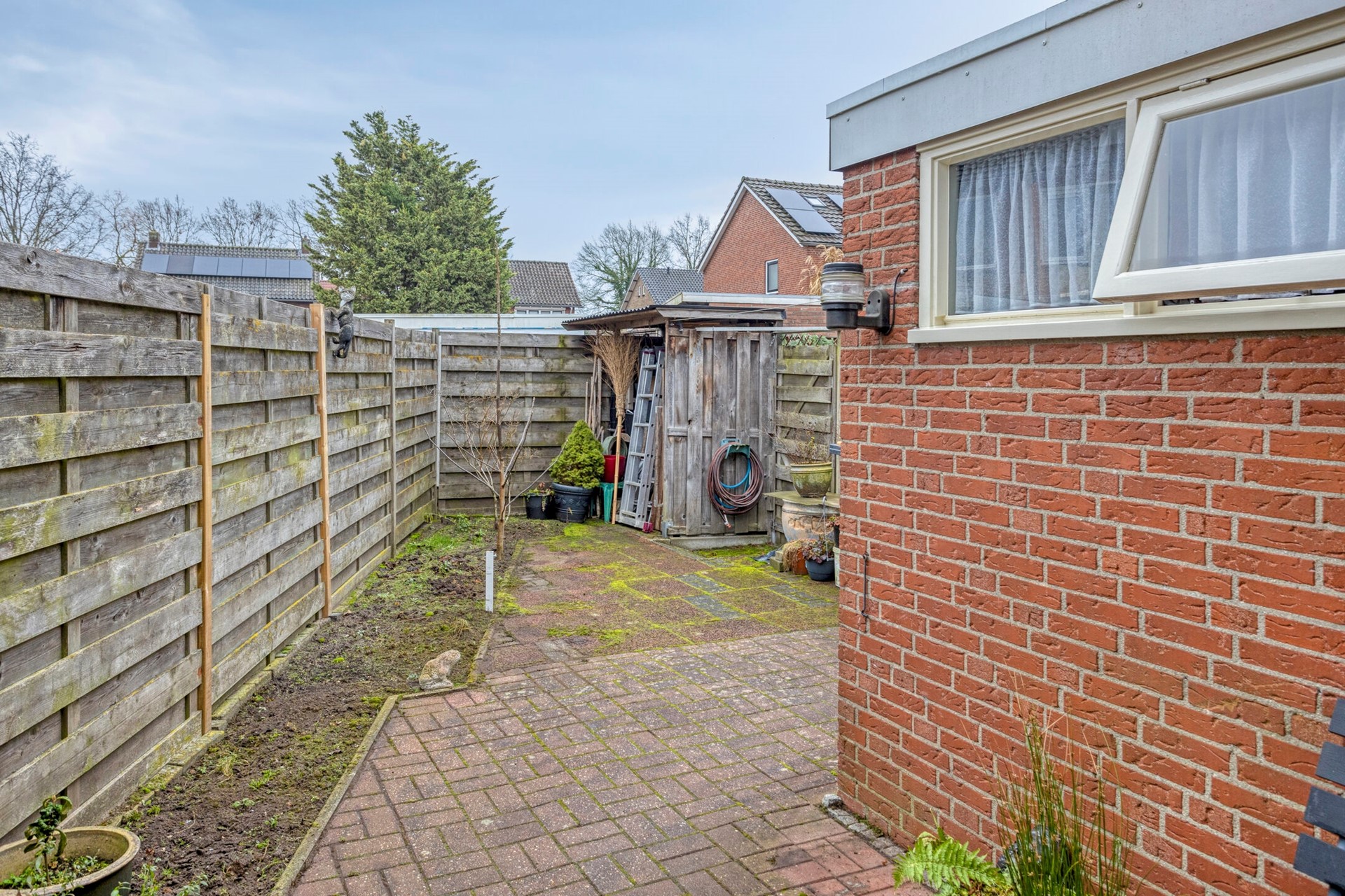 Vanuit de keuken als ook per achterom via de oprit is de tuin te bereiken. De tuin is gelegen op het oosten en biedt volop privacy mede door de hoekligging. De overkapping grenst aan de keuken en is een heerlijke plek om te genieten van het buiten zijn! De aangebouwde stenen berging is ideaal voor het stallen van de fietsen en het opbergen van diversen.