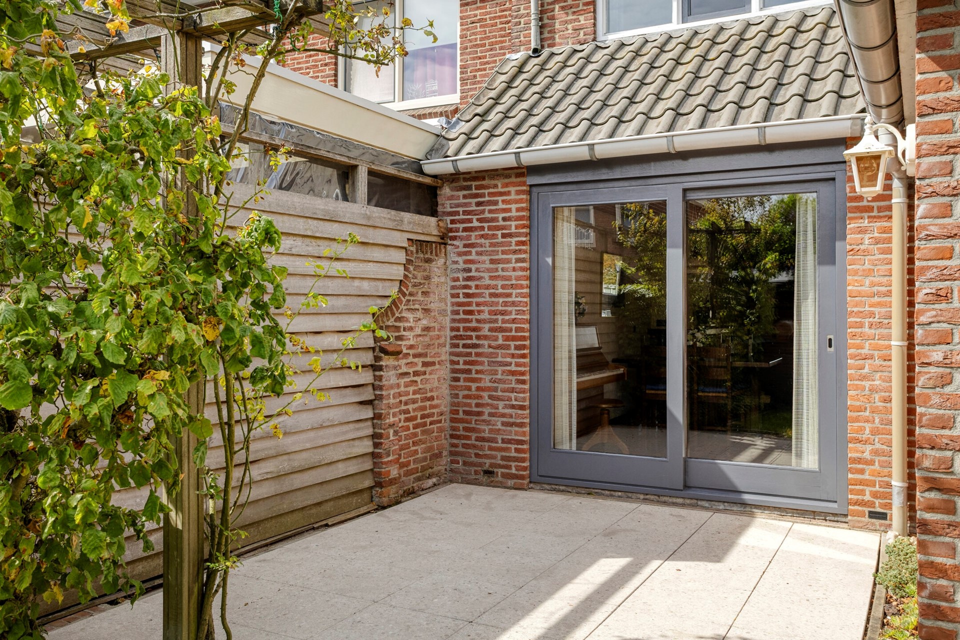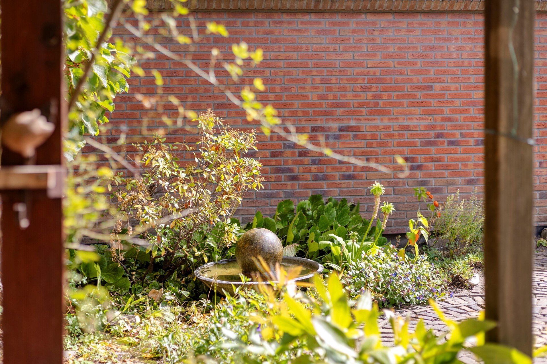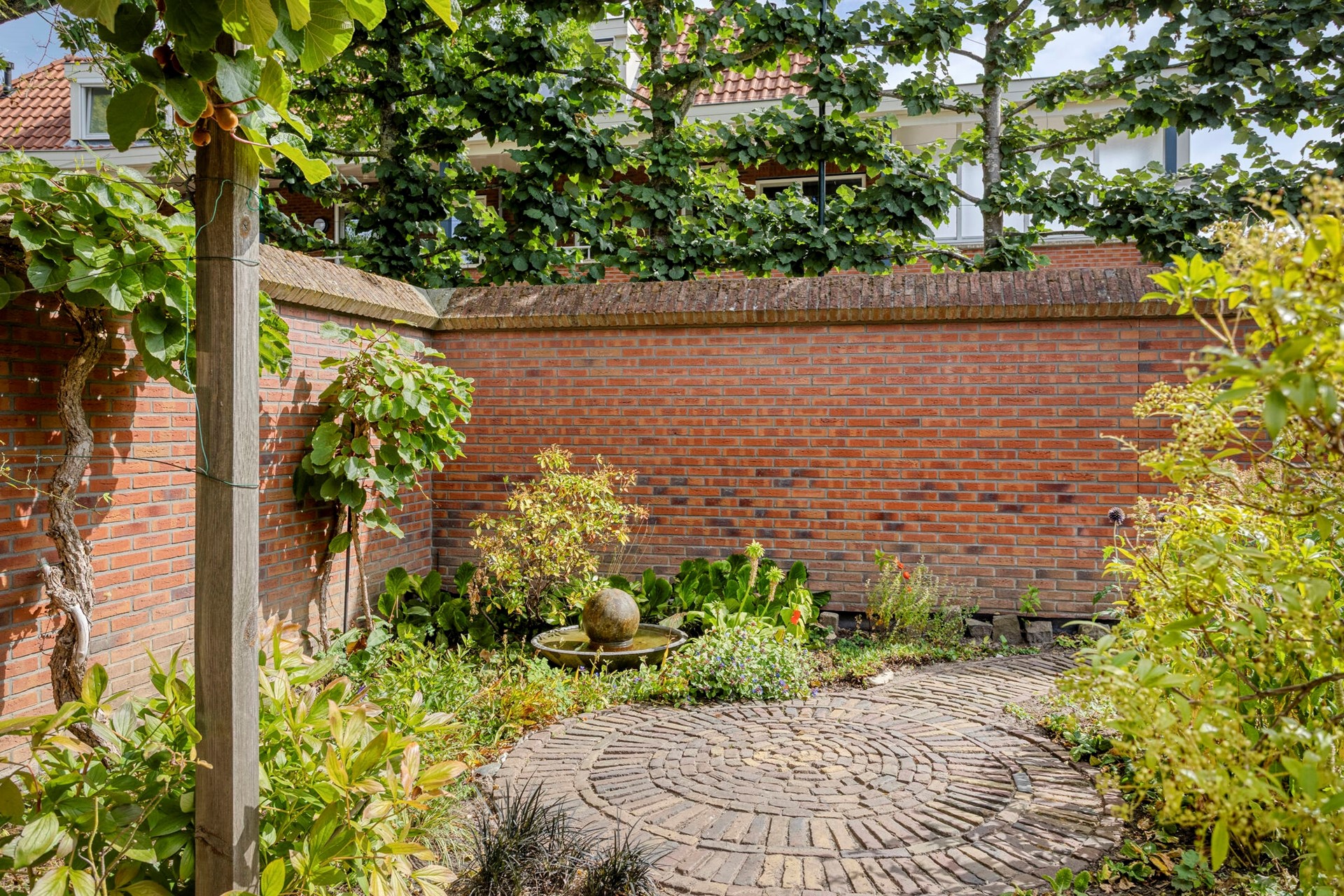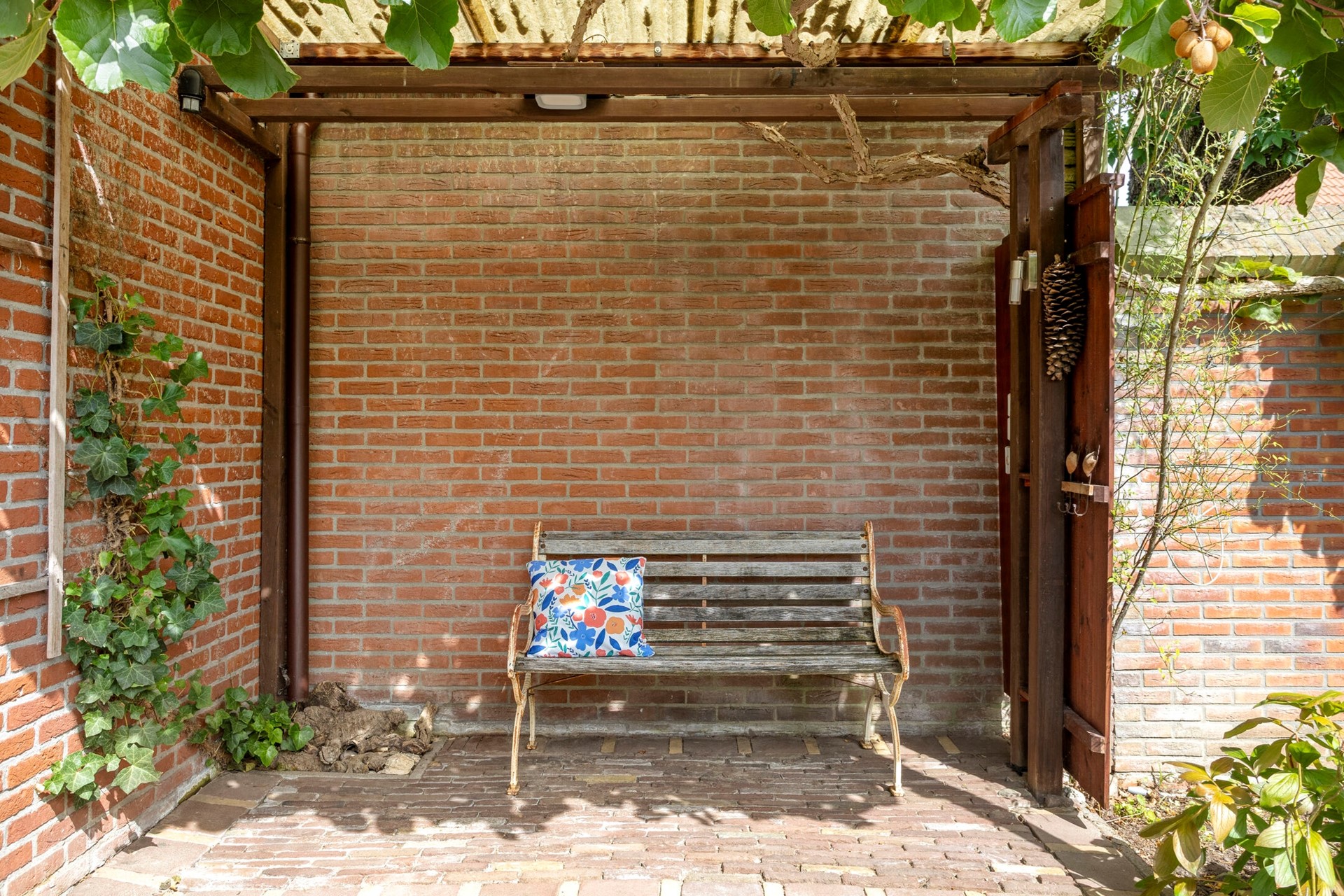 De achtertuin is gesitueerd op het Oosten en beschikt over een verhard terras welke direct toegankelijk is vanuit het eetgedeelte. De tuin is door groen omgeven als ook door een klassieke kloostermuur welke het tot een prachtig geheel maken! Verder is er een houten overkapping aanwezig en is er rechtstreeks toegang tot de garage. Deze ruimte is ideaal voor het parkeren van de fietsen en het opbergen van de tuingereedschappen. Daarnaast is er mede door de oprit plek om twee auto's te parkeren.